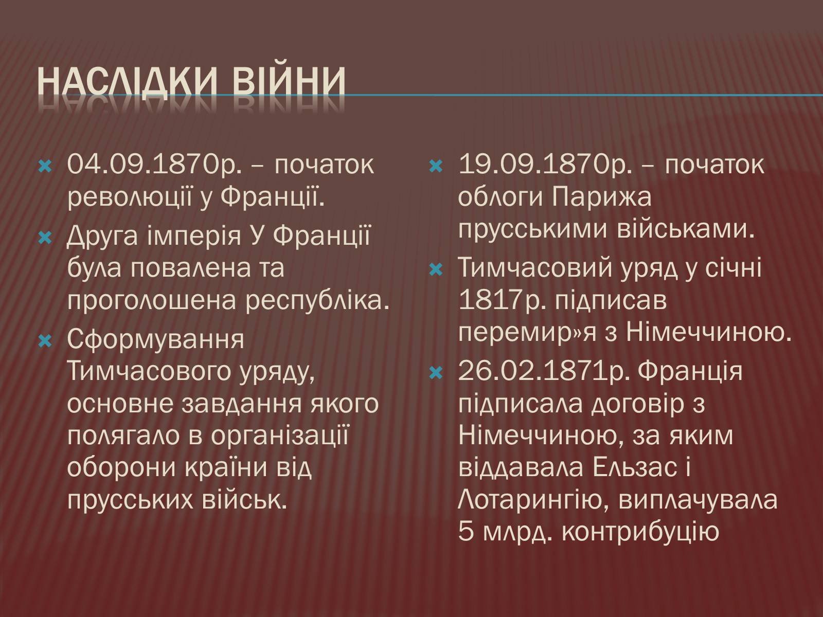 Наслідки франко-прусської війни такі: змінилося обличчя Європи, змінився лад життя країн, змінились долі мільйонів людей. Це був поворотний момент, який зумовив розвиток подій у XX столітті, навіть до війни, що мала стати “війною, яка покласть край усім війнам”. Історія – невблаганна вчителька, яка балансує на гострій межі між драмою та іронією.