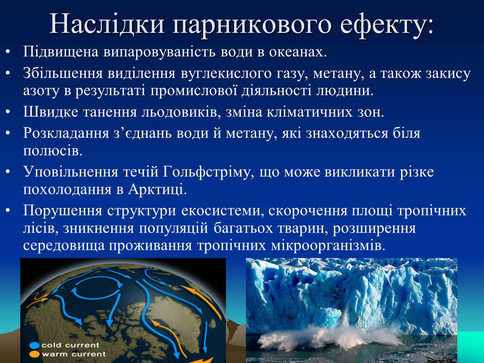 - підвищення температури океану — розтоплення полярних льодовиків
